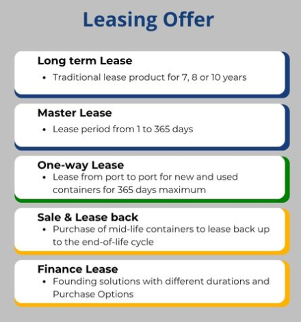 - Finance lease: service offered to support long-term and sizeable projects of containers acquisition and avoid immediate heavy CAPEX